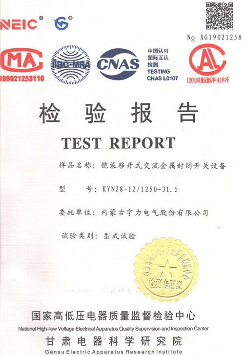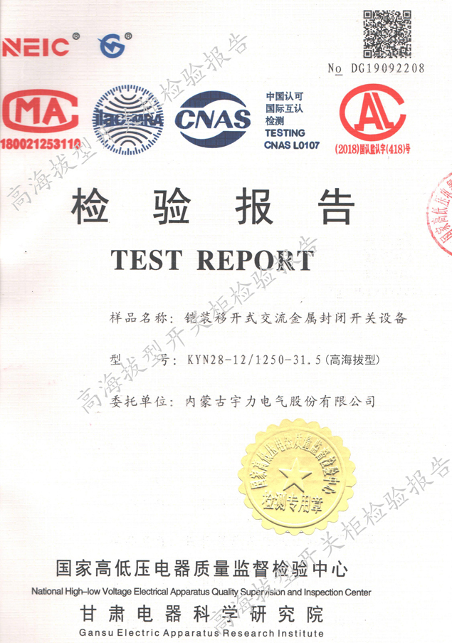 KYN28-12/1250-31.5高海拔型中置式開關(guān)柜(試驗報告)