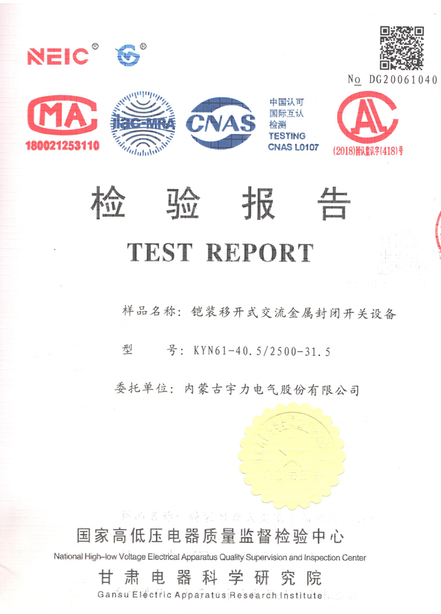 KYN28-12/4000-40中置式開關(guān)柜(檢驗報告)