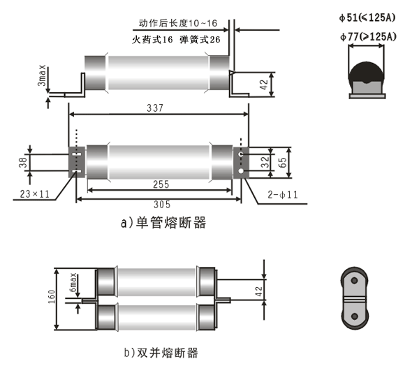 ① 以上是單管額定參數(shù),可根據(jù)用戶需要采用固定結(jié)構(gòu)將熔斷器并聯(lián),可得到高的額定電流值。
