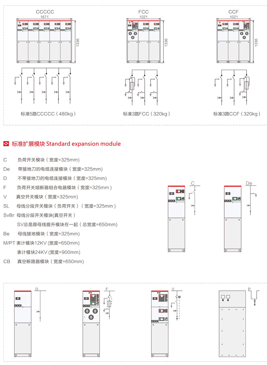 開關(guān)柜為模塊化單元模式,可根據(jù)不同用途進(jìn)行組合;由固定式單元組合與可擴(kuò)展型單元兩大類,滿足各種變電站對(duì)緊湊型開關(guān)柜靈活使用的需要。